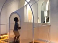 An installation that acts as an architectural intervention, continuing the interior gallery space to the exterior. A sculpture that offers an immersive and interactive experience. It follows the rigid structure of the window, however it's softened by two layers of mesh, which degrade in thickness as to have the thinnest one hold the spectator inside more intimately. The structure has an inclination which changes the perspective of the space when seeing it from the inside, while the outside forces the viewer’s body to bend and adapt their bodies to fit inside. With the addition of water, its sound, and light – the piece intends to activate our senses and experience.